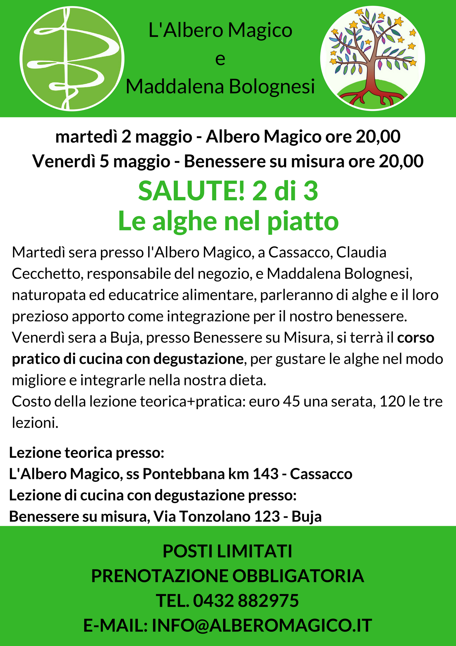 Lezione pratica con degustazione del corso per il corretto uso delle alghe nella nostra dieta a cura di Claudia Cecchetto e Maddalena Bolognesi. Prenotazione obbligatoria.